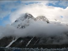 In Photos: Left: Stormy Broad Peak viewed from Camp I on the Cesan Route (K2) Right: K2 shrouded in clouds viewed from Base Camp |